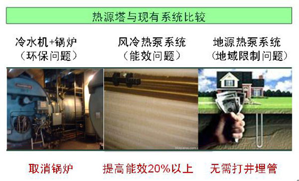 傳統水冷冷水機只能制冷,熱源塔熱泵系統不僅可以制冷制熱,還可制取生活熱水,一機三用。 可以取消鍋爐房,解除安全顧慮,達到節省機房用地、節省操作人員、節省運行費用、減少碳排放的效果。 熱源塔熱泵系統的功能與地源熱泵系統都可一機三用,但是其造價卻比地源熱泵低得多,也不必顧慮地源熱泵系統由于地下換熱器的計算問題或是施工質量問題所引起的失敗風險。