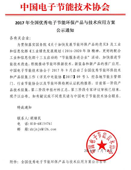 2018年1月19日--湖南紫伊智能機械設備有限公司高節能環保新能源事業部所主導的“大氣能與太陽能、地熱能綜合開發環保利用高科技系統項目”榮獲“全國優秀電子節能環保產品與技術應用方案”公示名單項目!這是中國電子節能技術協會依據國務院、工信部十三五“節能服務進企業活動”精神,加快推進節能技術改造,積極推動節能環保新技術、新裝備和新產品的推廣應用活動。