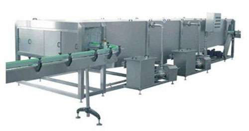 灌裝封蓋后的飲料由輸送網帶依次進入殺菌段進高溫噴淋熱水殺菌,預冷卻段通過噴淋溫水進冷卻,冷卻段通過低溫噴淋水冷卻,最后由頂部不銹鋼噴嘴噴出軟水清洗。